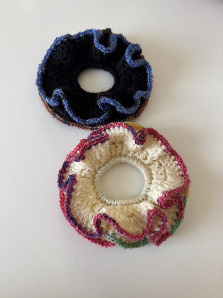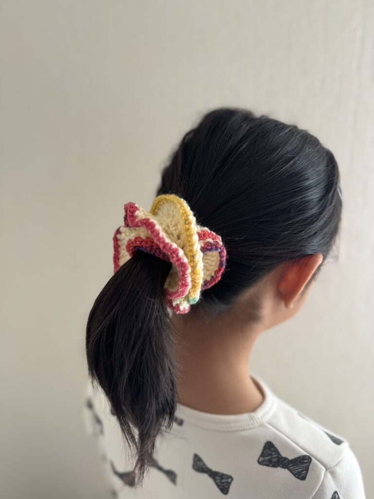 いろいろなカラーのシュシュが編めます。髪を結んでつけても使えますが、手首につけてもかわいいのでボリュームはお好みで調整できます。