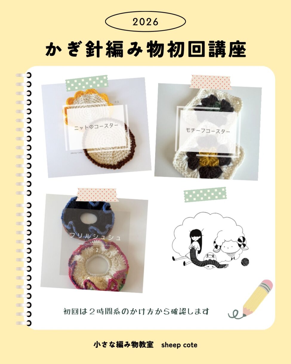 こちらは編み針を持ったことがない初心者の方や久しぶりに編むので編み方を確認したい方向けです。道具も貸し出ししていますので、手ぶらでの参加可能です。