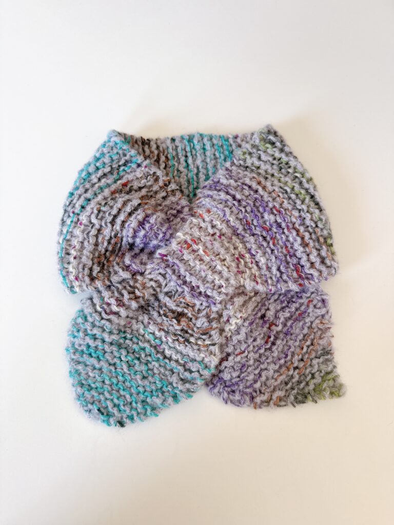 短めのマフラーなので長く編む練習に丁度良いサイズです。つけ襟みたいな、持ち運びも便利なマフラーです。サンプルはモヘア系の糸とソックヤーンの引き揃えで編んでいます。シンプルな一色の糸でもモヘアでも好きな糸で編むことができます。お家ににソックヤーンが余っていたらぜひ編んでみてください。