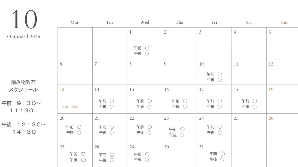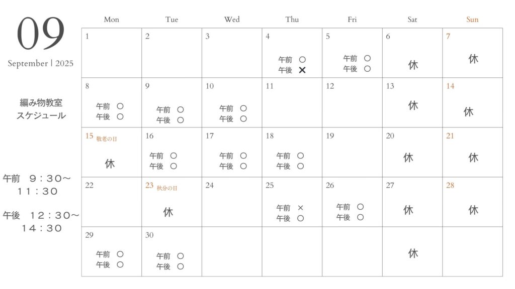 下記空き状況をご確認ください。初めての方は編物教室についてを一読お願いします。